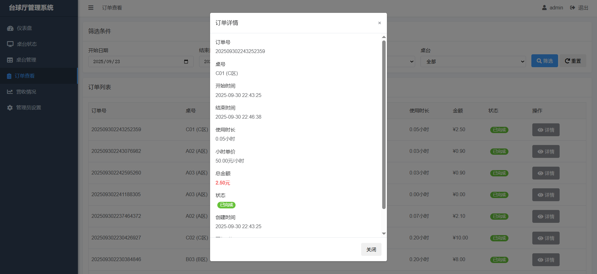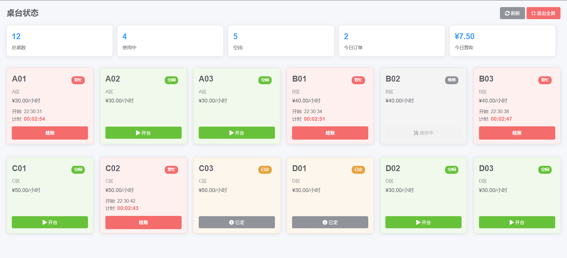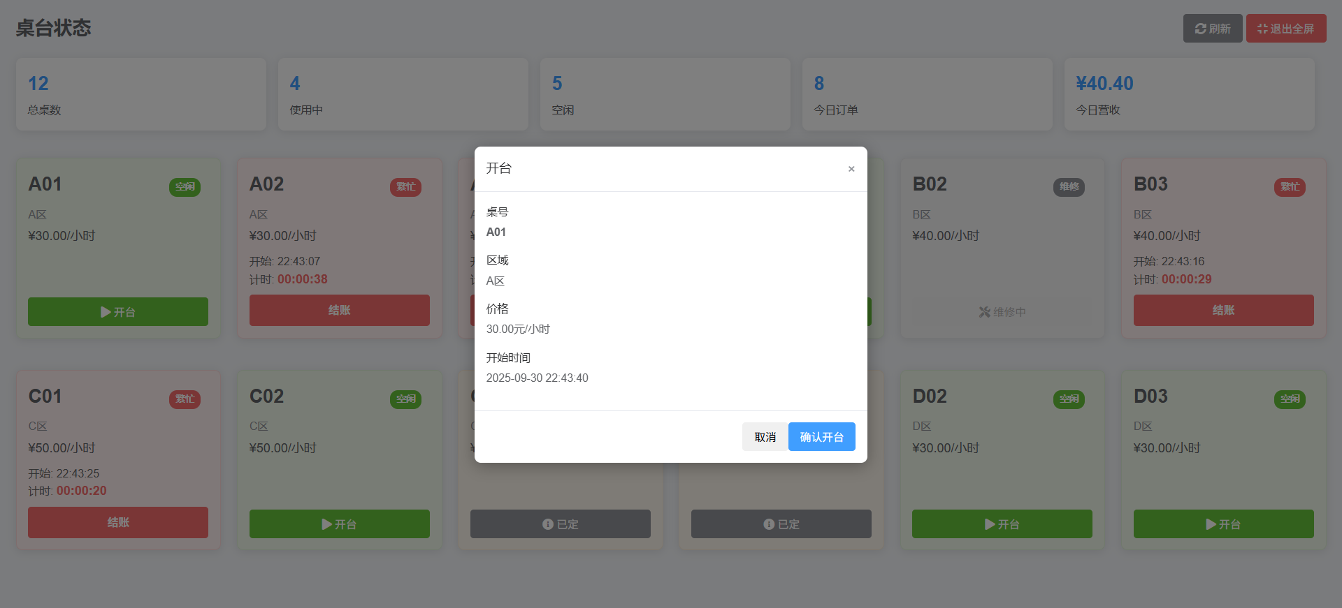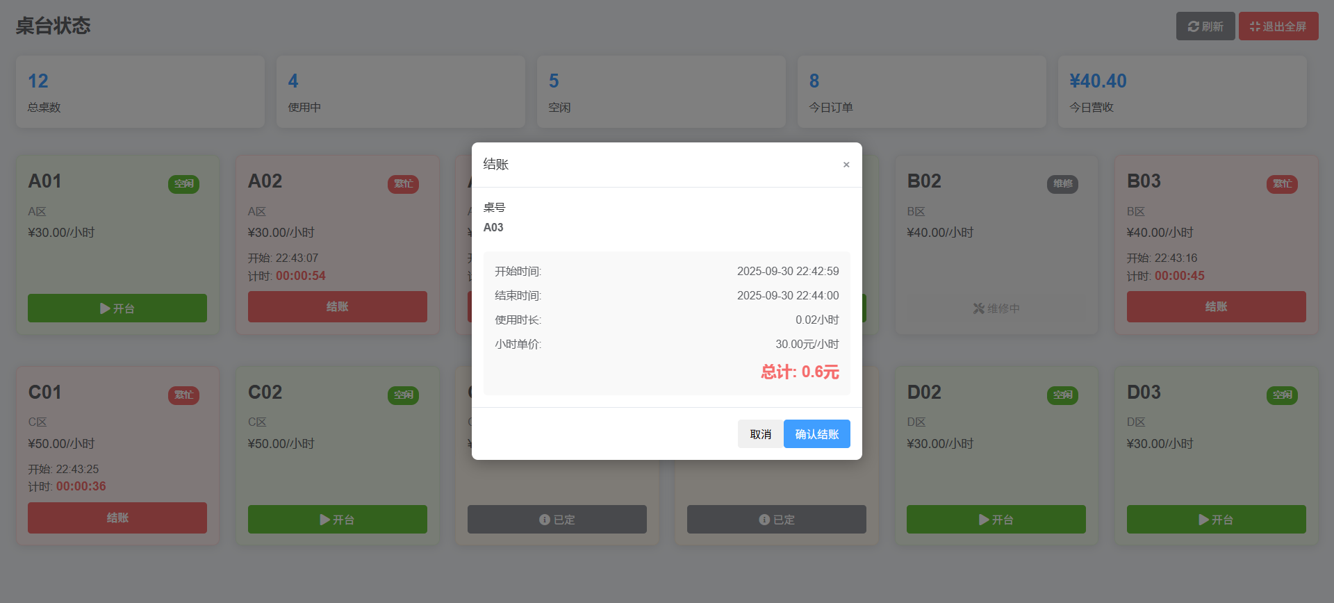 管理员可通过系统一键开台计时,并在离场时完成结账流程,自动计算消费金额。