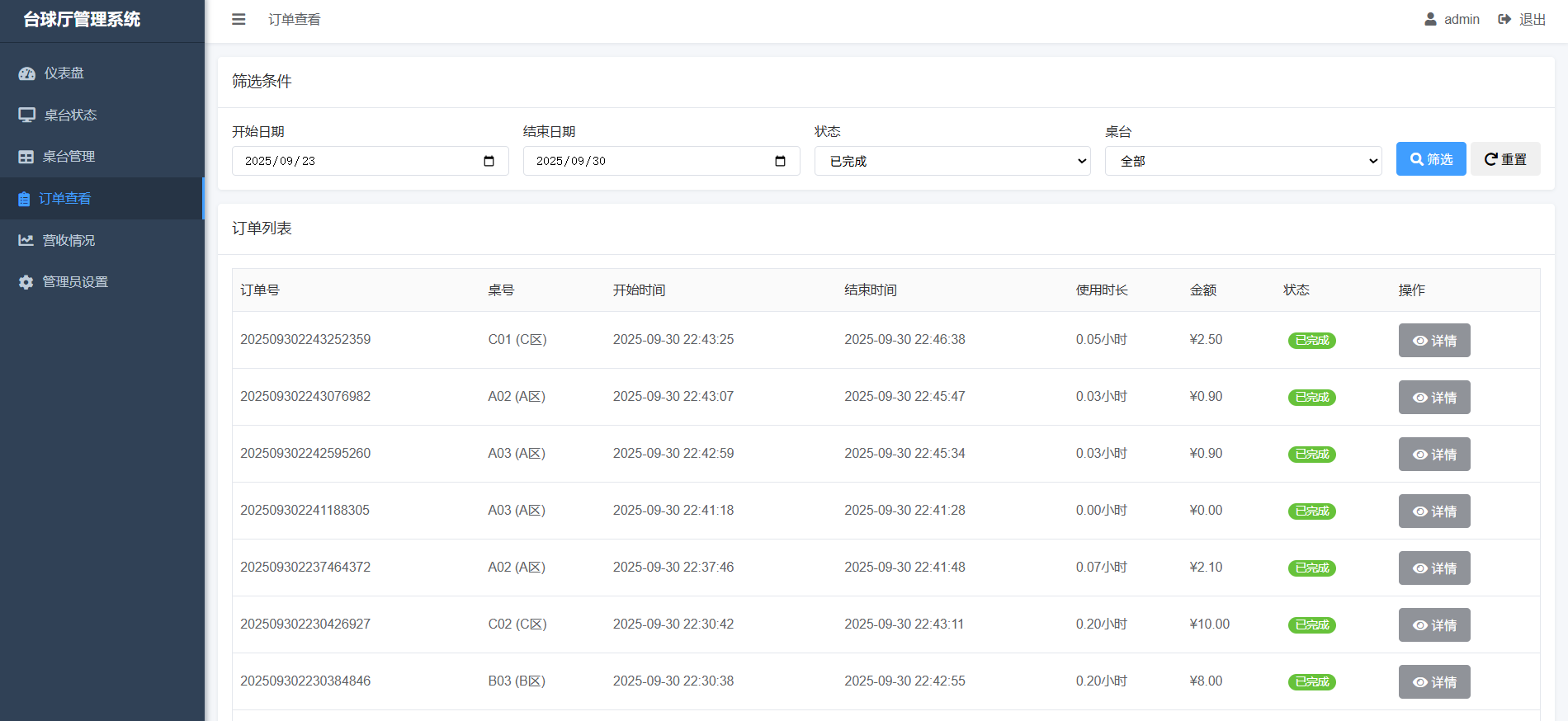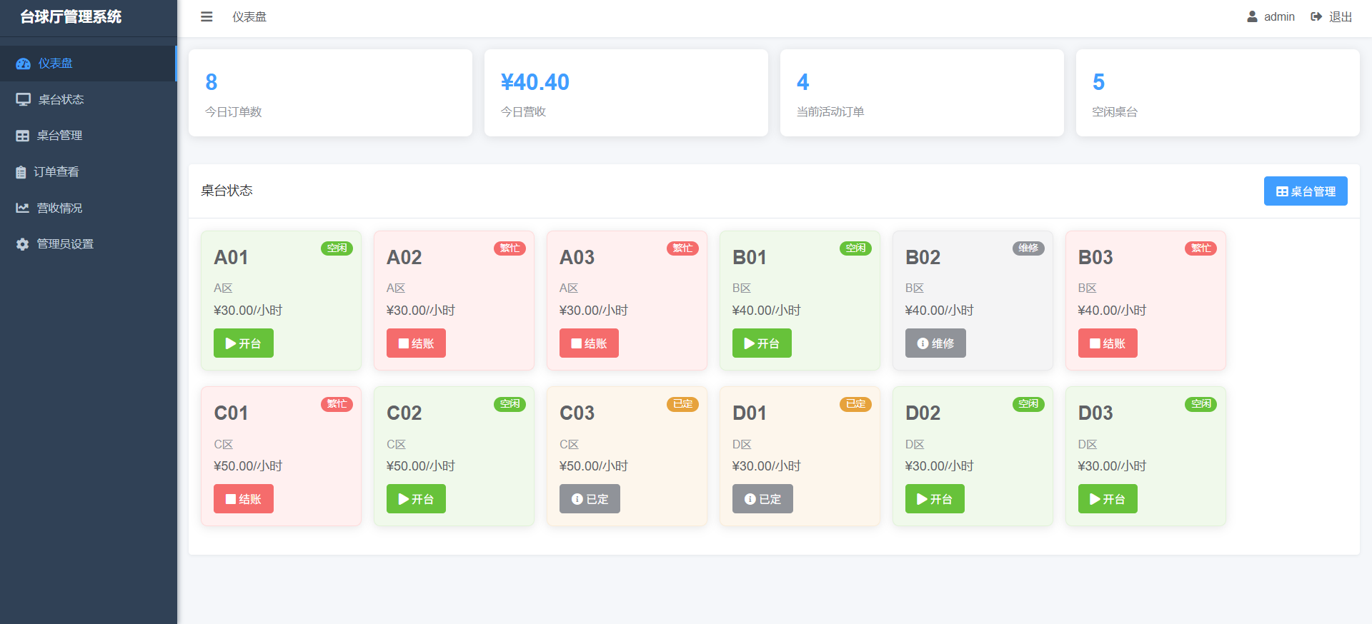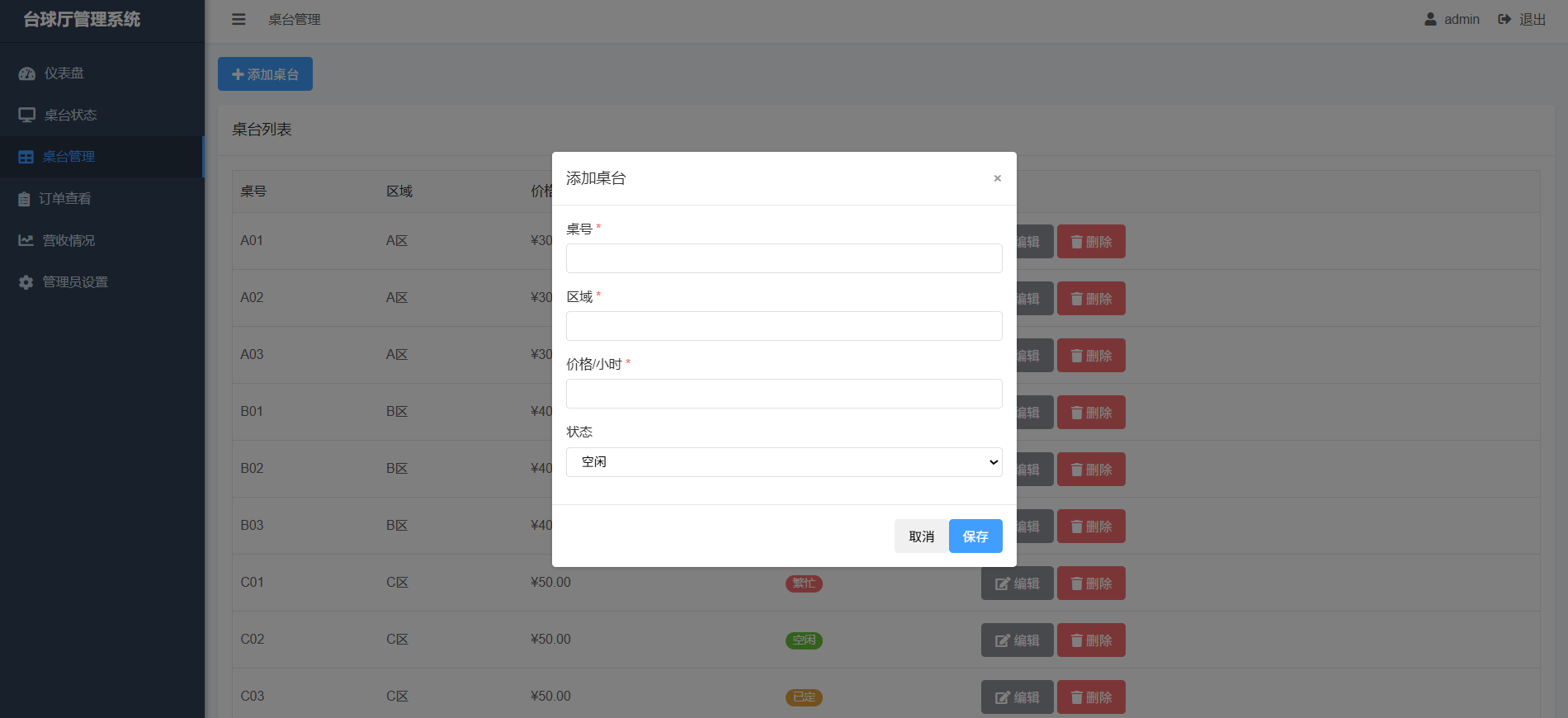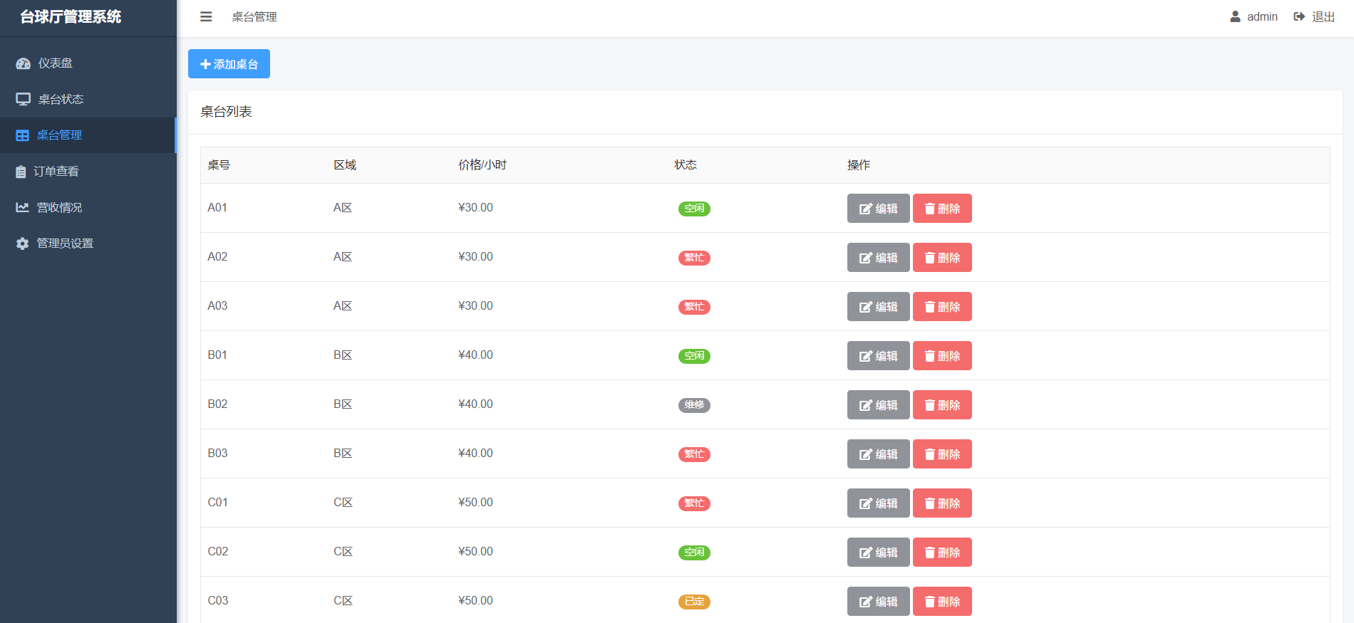 系统内置完整的桌台管理功能,支持对所有球台进行添加、编辑和删除操作。