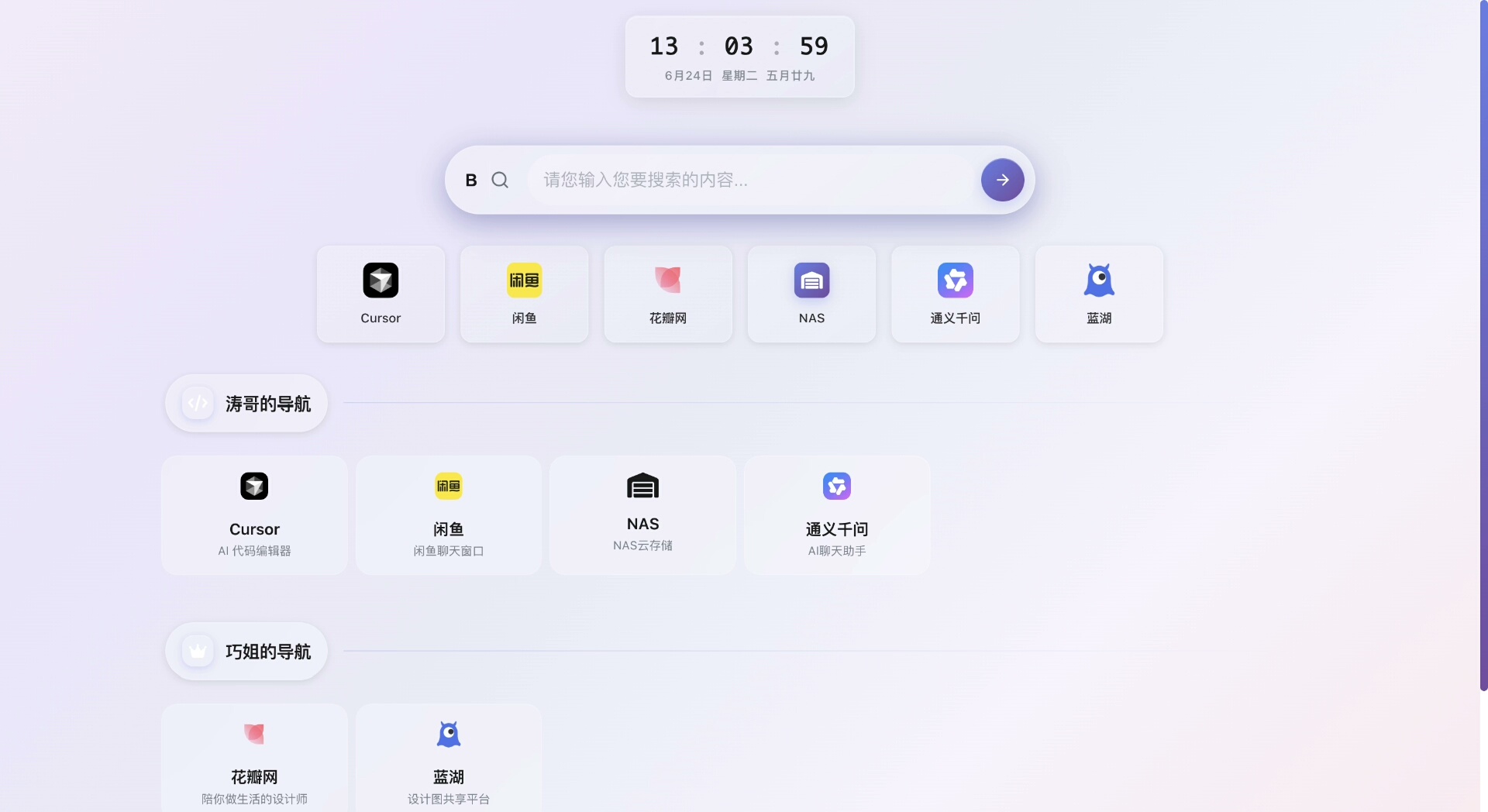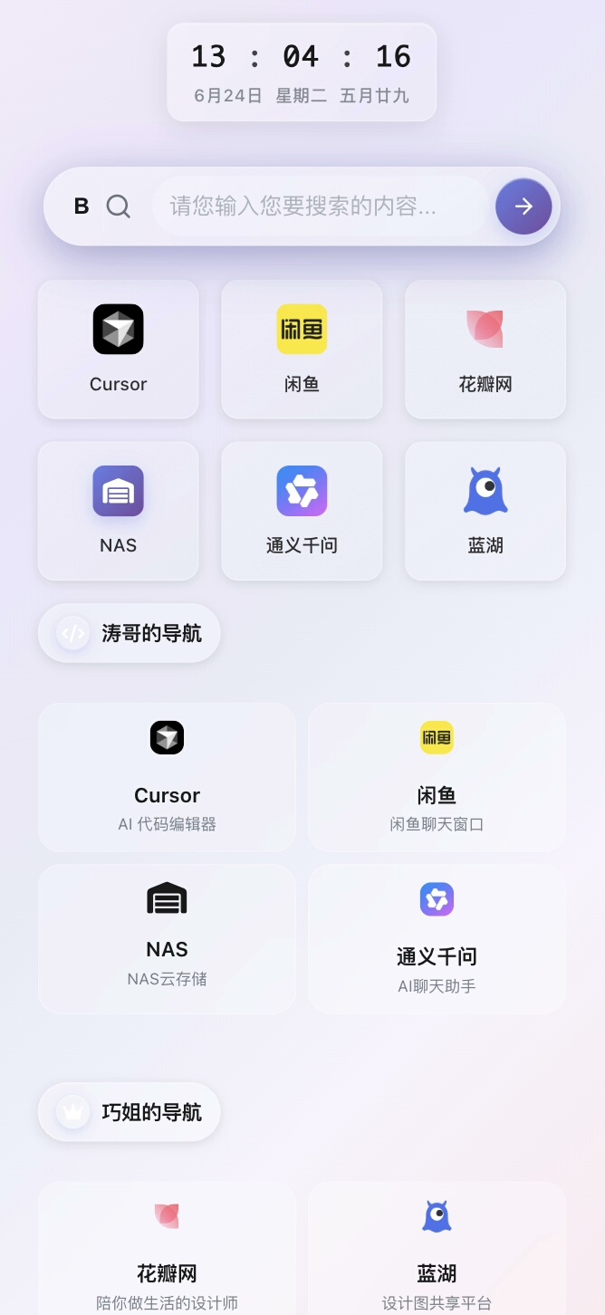 本款网址导航系统为本人独立开发的原创作品,界面设计简约大气,用户体验流畅,适合用于个人或小型团队搭建专属导航网站。