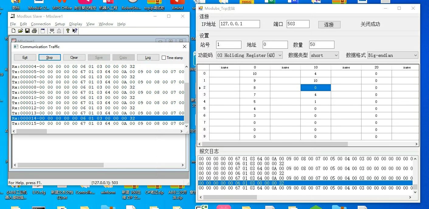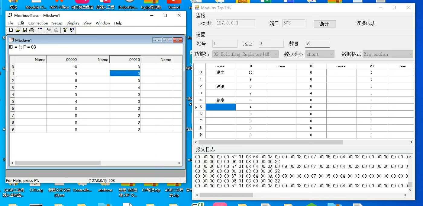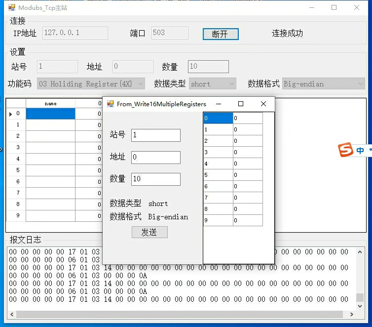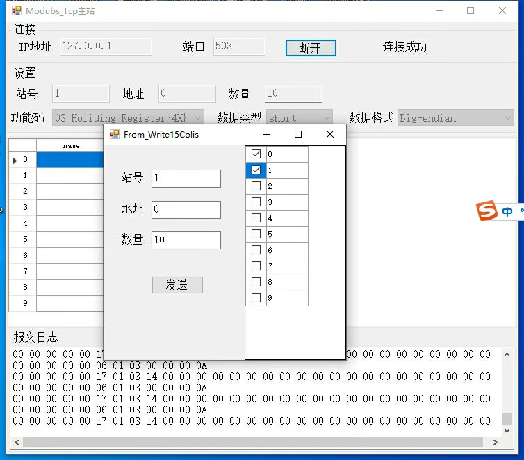 界面内置收发报文日志窗口,便于开发者分析通信流程。