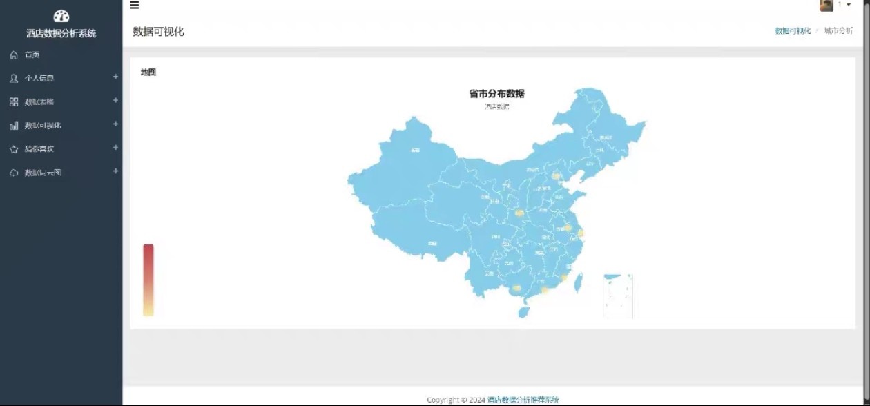 系统配备可视化大屏,使用ECharts将用户行为趋势、热门酒店排行、评分分布等关键指标以柱状图、折线图、热力图等形式直观呈现。