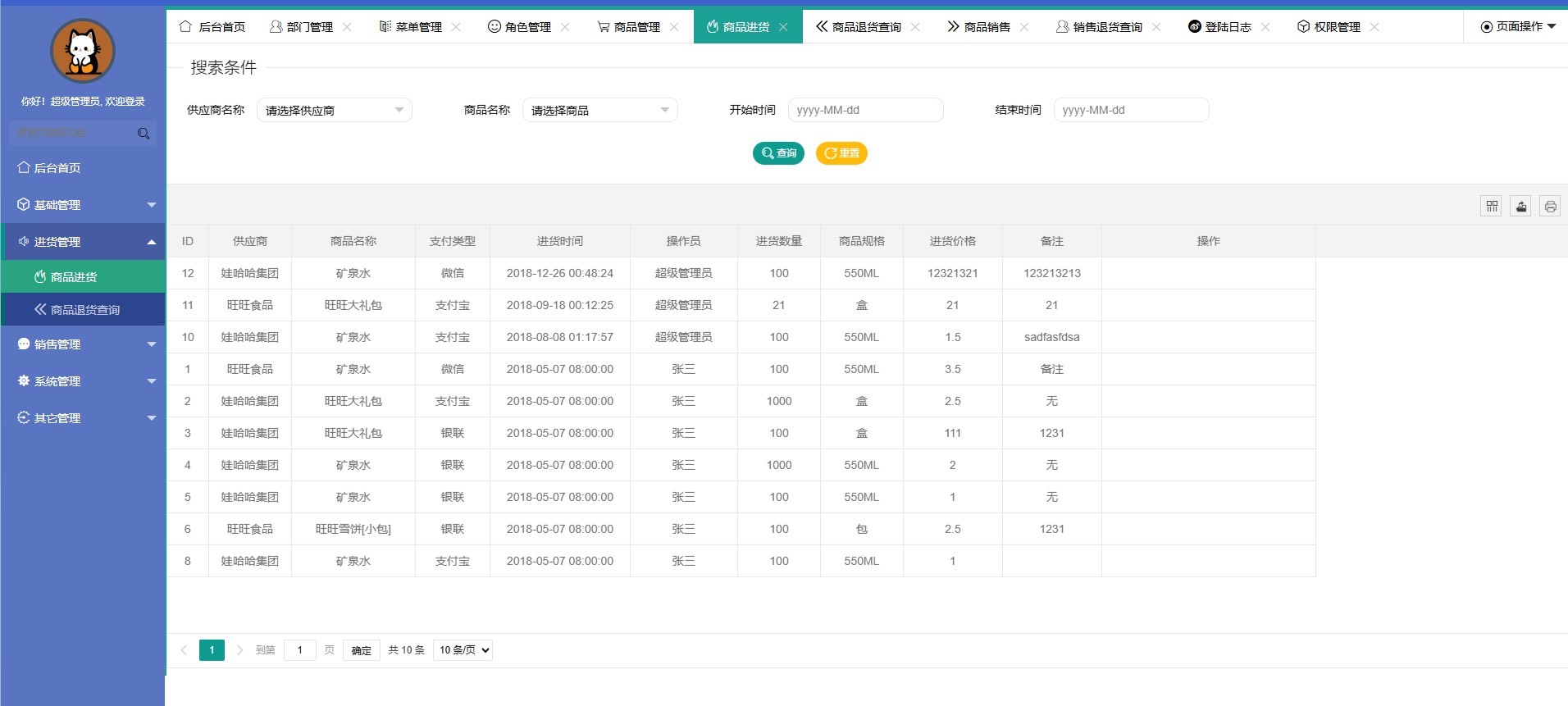 系统具备完整的进销存管理能力,涵盖基础数据维护到业务单据处理全流程。