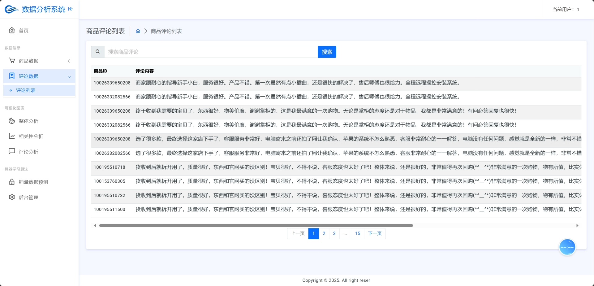 针对用户评论文本,系统调用预训练的BERT模型进行情感极性判断(正面/负面),并通过词云图、柱状图等形式直观展示情感分布。