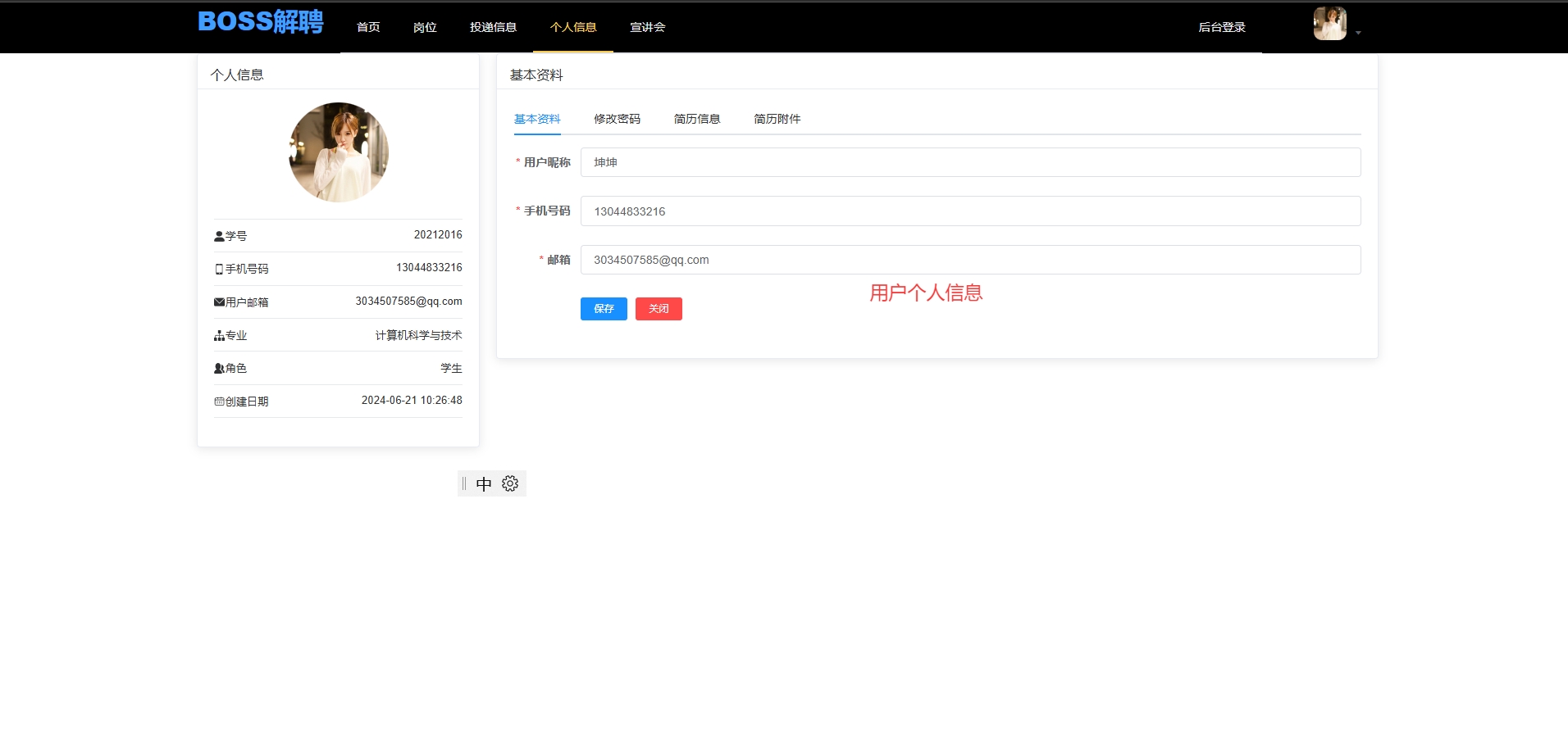 学生可上传简历附件,并随时修改个人简历内容及基本信息。