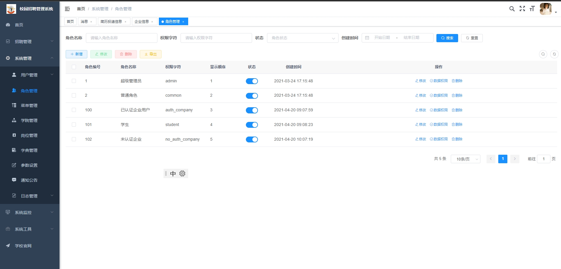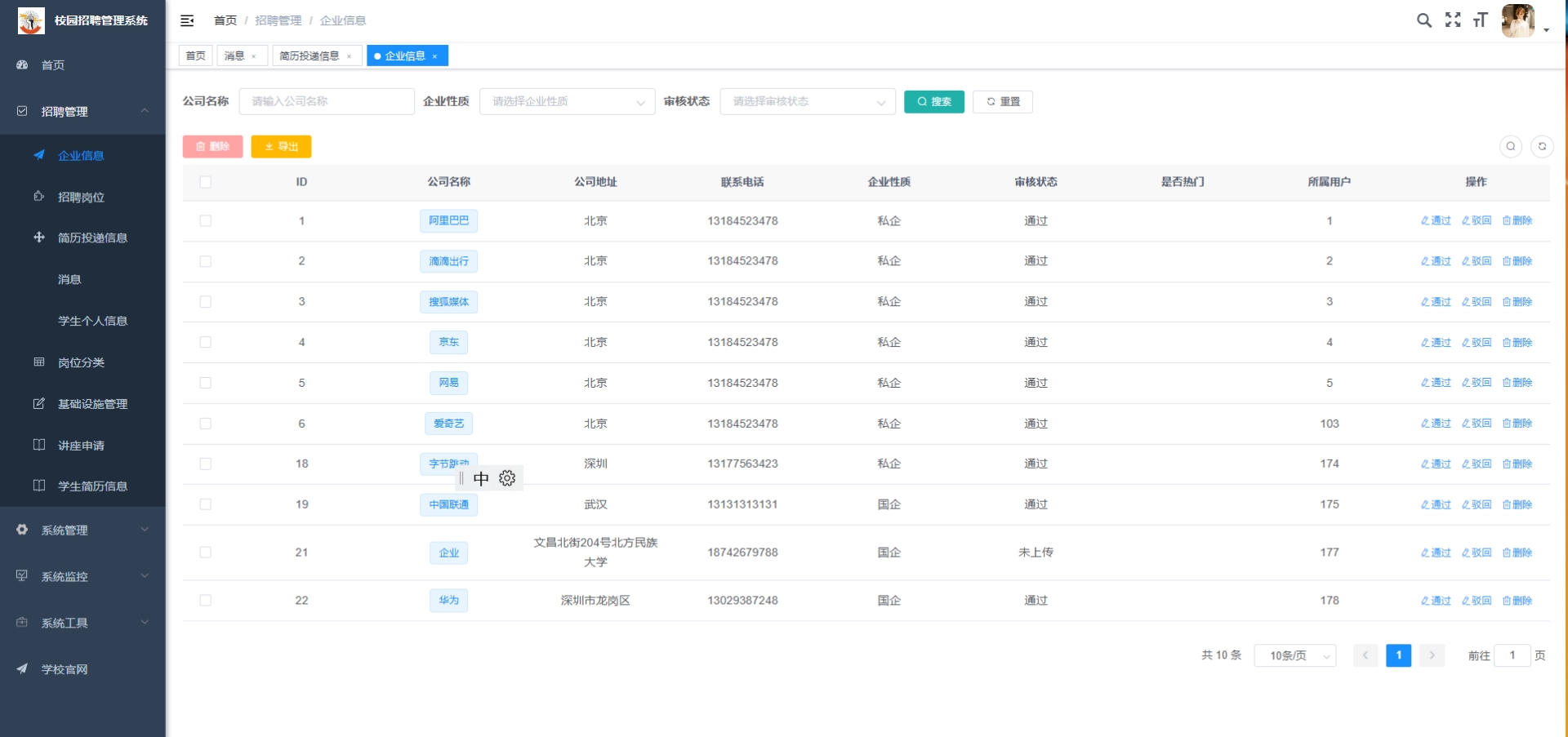 通过登录管理后台,可对学生和企业用户的注册信息进行审核与管理,包括账号封禁、角色分配等操作。