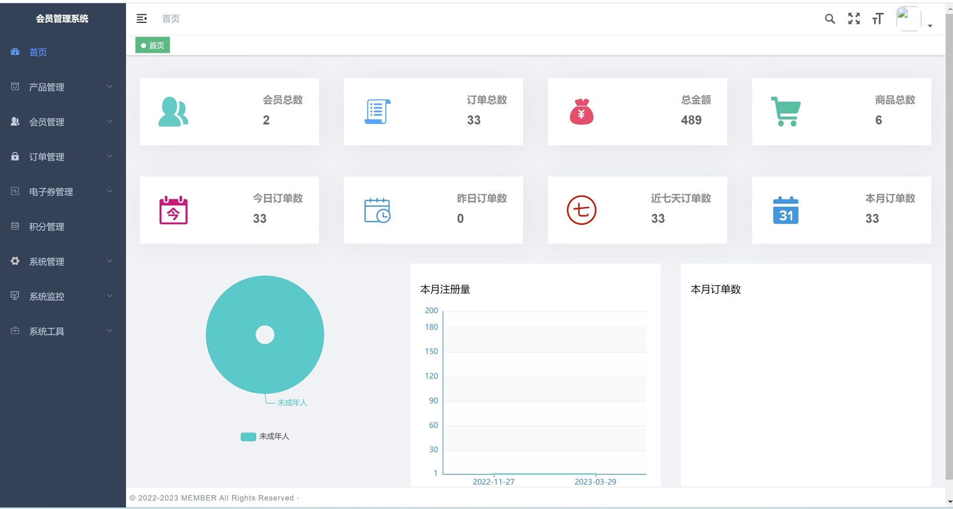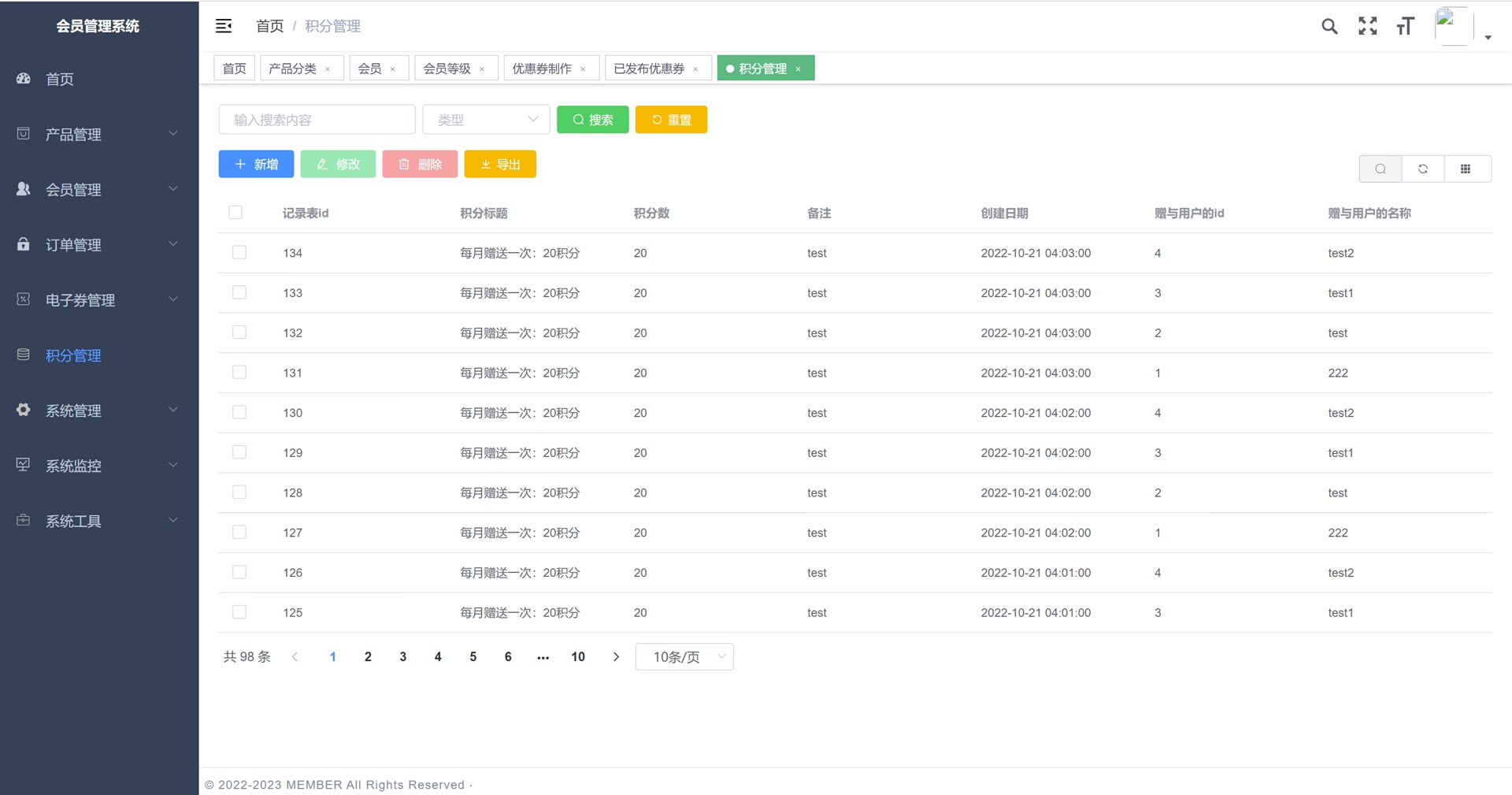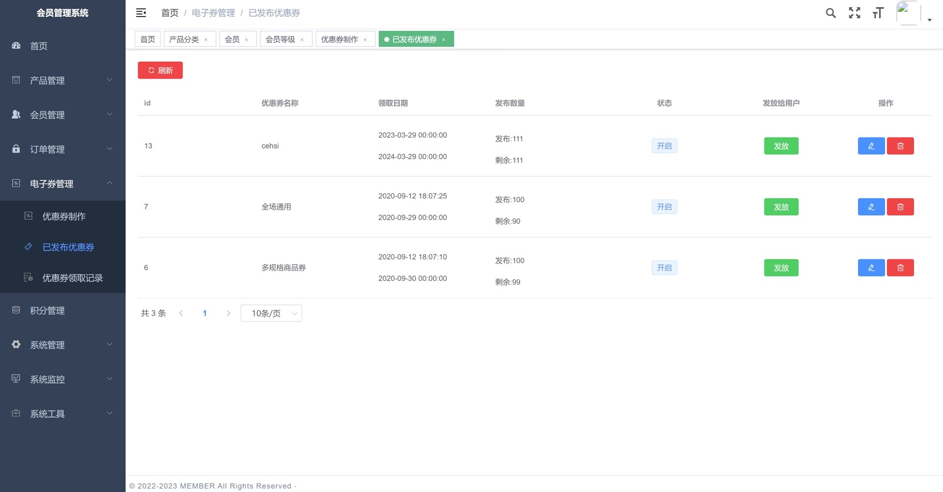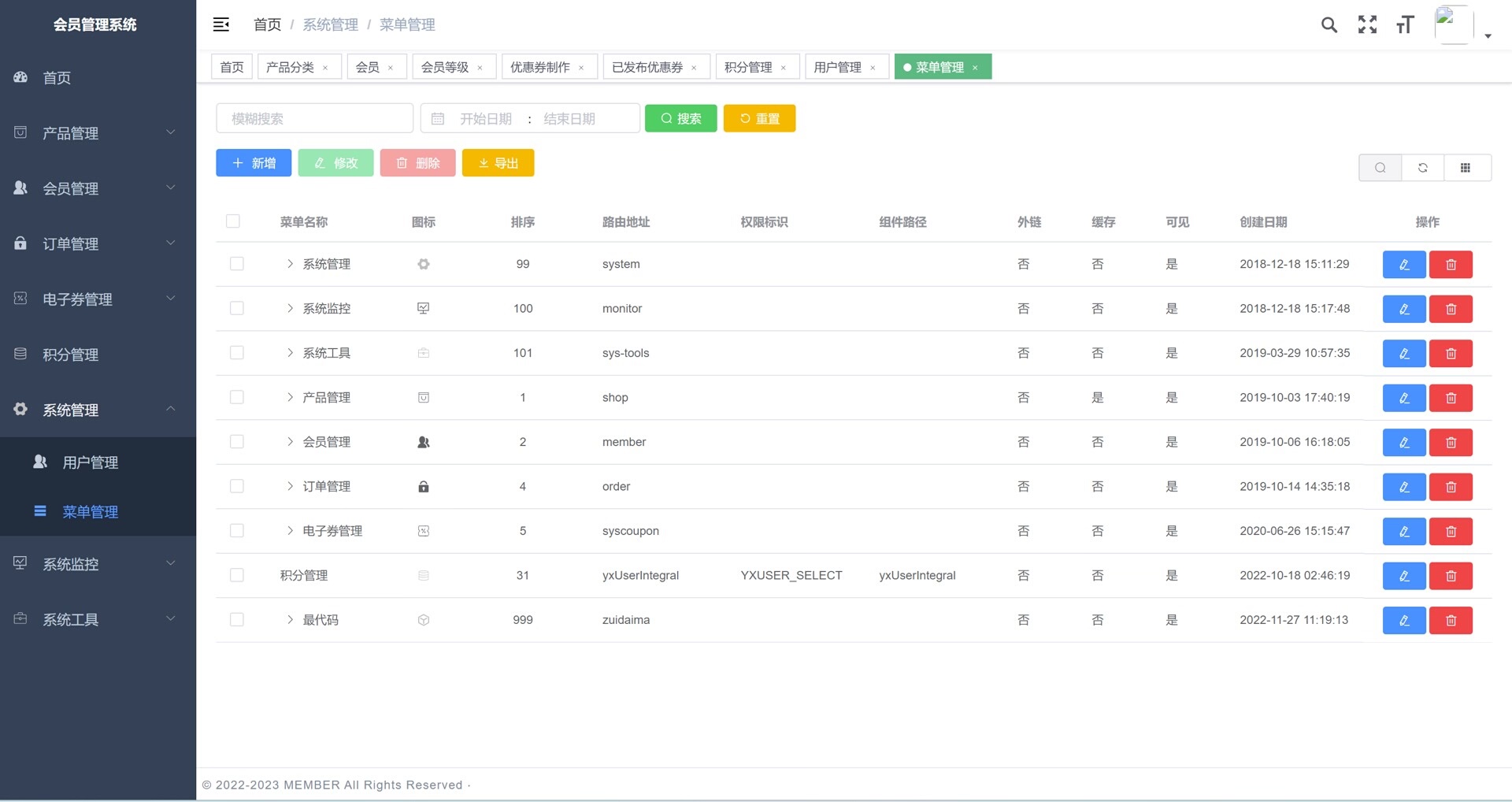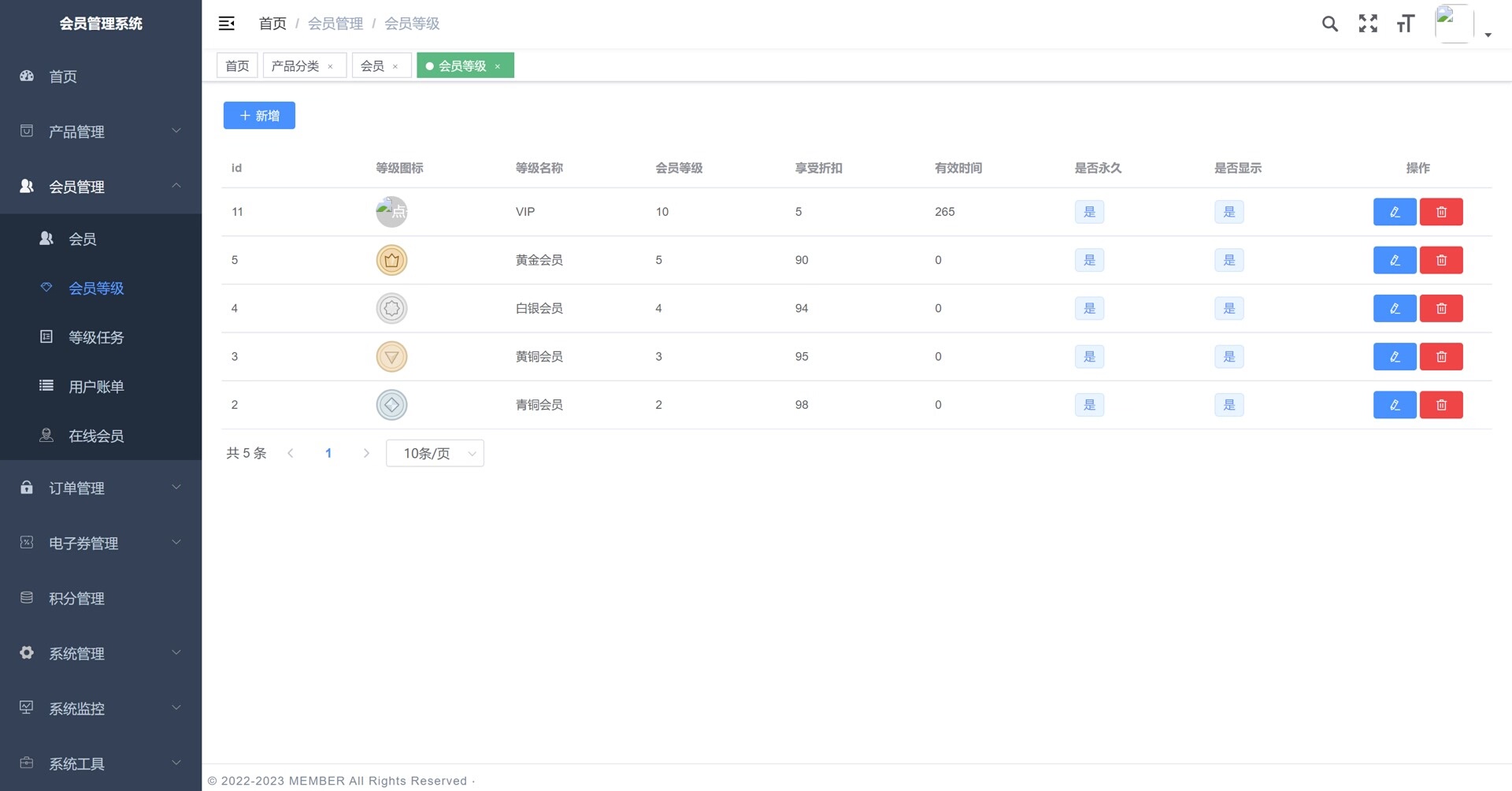 系统涵盖多个实用管理模块,包括首页数据统计可视化,产品管理(含产品分类与产品中心),体系管理(支持信息、等级设置、等级任务配置、账单记录及在线),订单全流程管理(订单详情与跟踪),电子优惠券系统(支持优惠券创建、发布管理及领取记录查询),积分机制管理,以及全面的系统管理功能如用户权限控制、菜单配置等。
