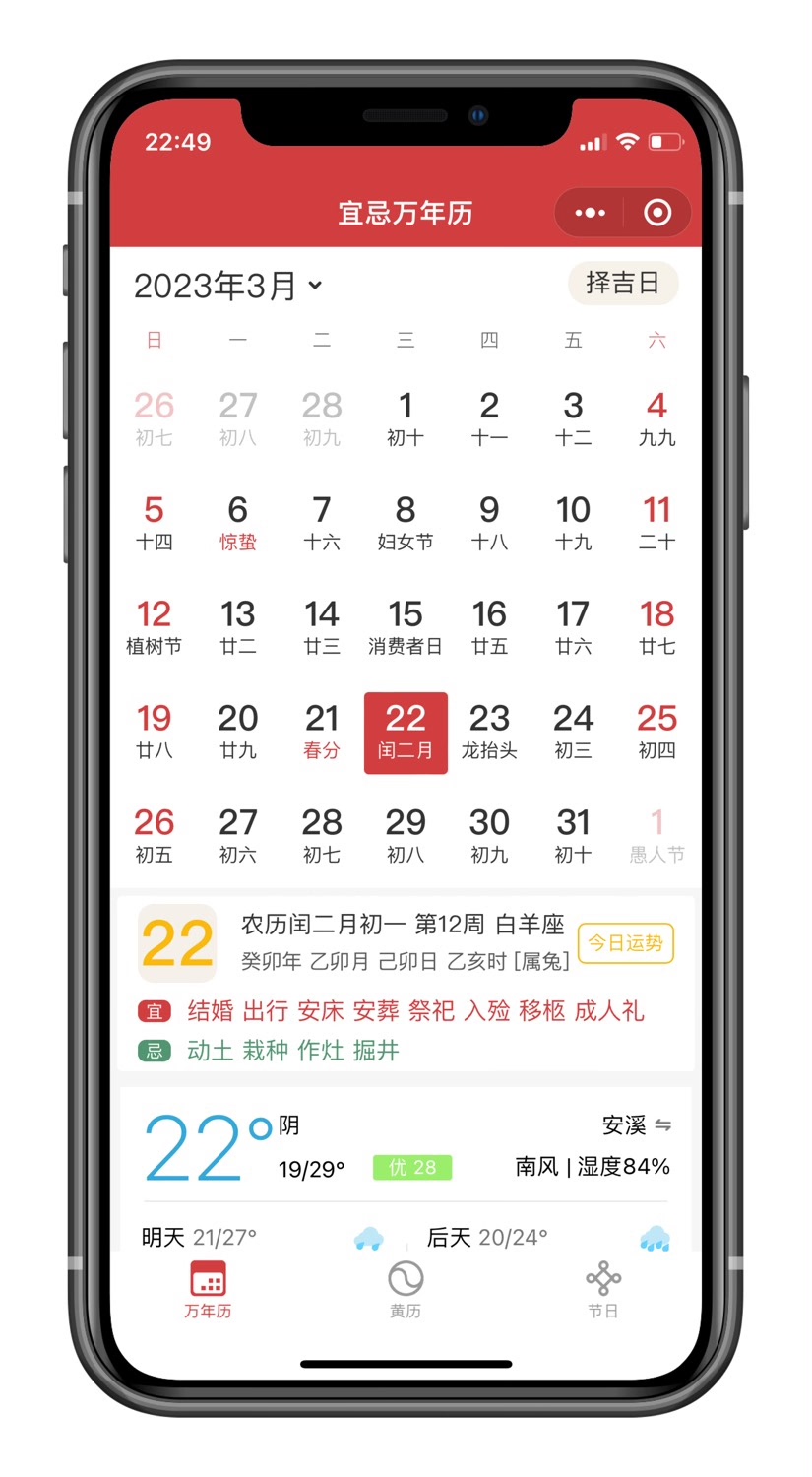 更多功能演示请前往【宜忌万年历】小程序查看。