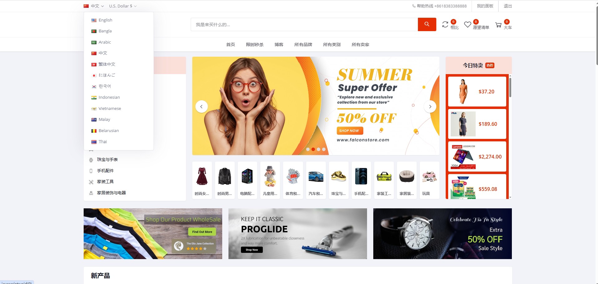 系统内置前端12国语言切换功能,轻松满足跨境业务的本地化需求,助力商家拓展海外市场,提升国际化品牌形象。