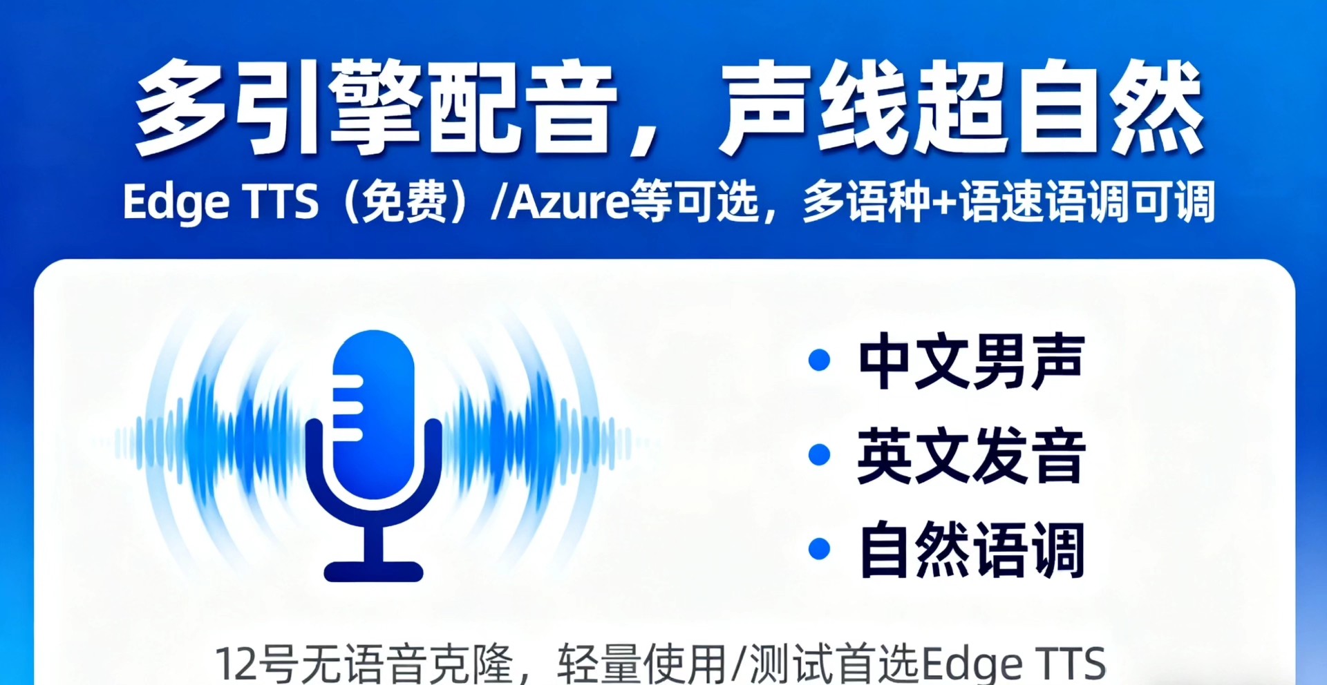内置Edge TTS(可用)、Azure语音服务等多种语音引擎,提供中文男声、多语种发音选项。