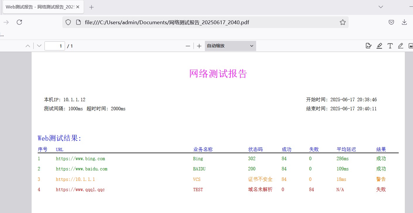 支持将完整的测试过程与结果一键生成PDF格式报告,便于归档、分享与汇报。