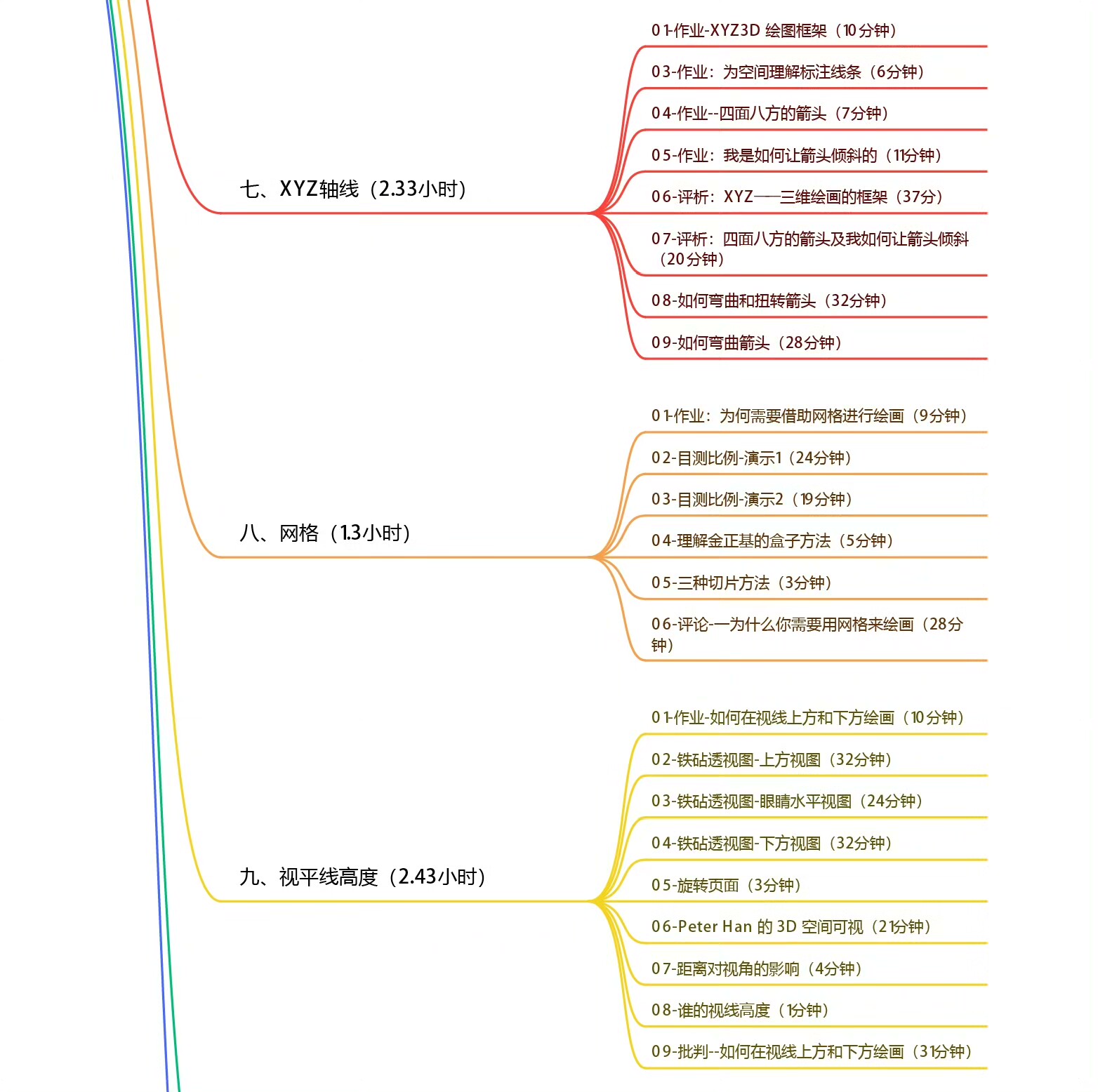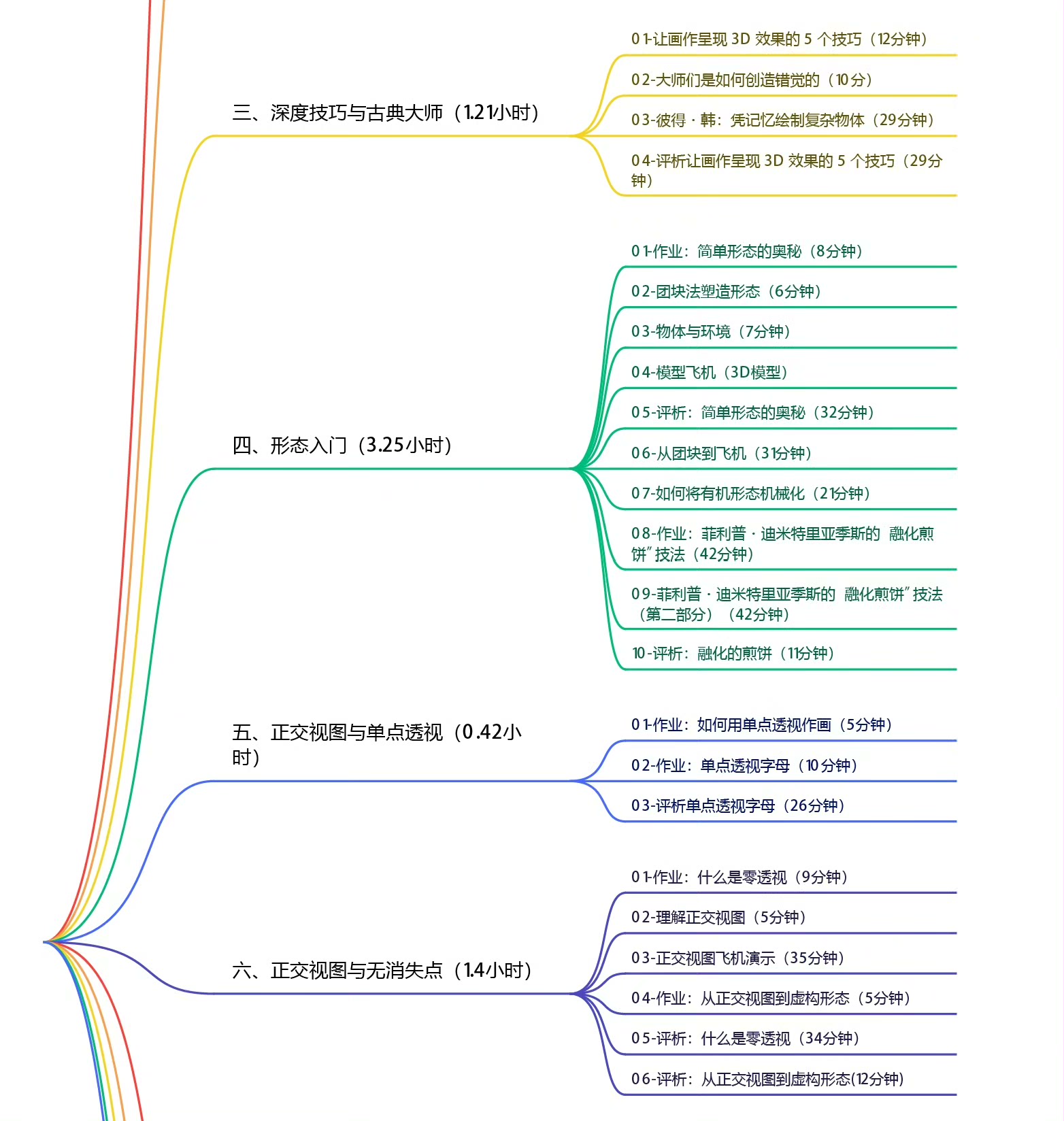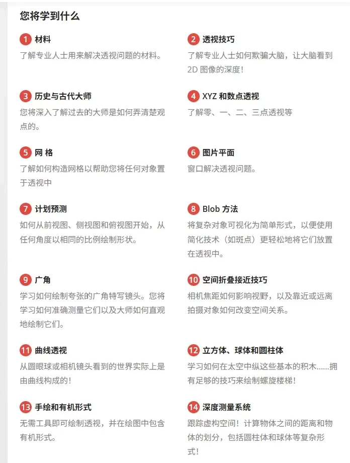 课程内容涵盖透视基础、网格绘制、三维空间表达、广角与曲面透视等多个关键模块。