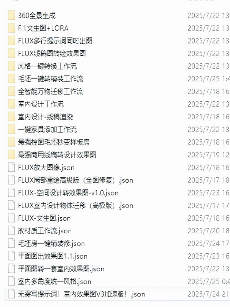 另含FLUX系列功能配置文件:包括图像放大、局部编辑、空间效果图转换、物体迁移、文生图等功能的.json文件,例如“FLUX放大图像.json”、“FLUX-空间设计转效果图-v1.0.json”等。